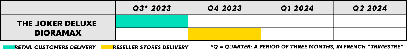 The estimated delivery period of The Joker – Deluxe Edition – HQS Dioramax is the same, with shipments that should last the whole Q3 2023 for retail customers and partner stores and the whole Q4 2023 for reseller stores, as indicated in the product sheet.