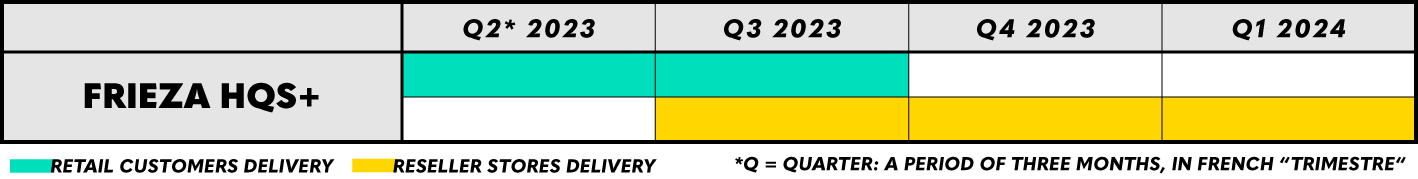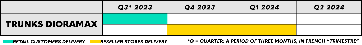 Deliveries of Future Man Trunks' Time Machine - HQS Dioramax are expected to take place in the future, throughout Q3 2023 for retail customers and partner stores, while shipments to reseller stores are expected to last from Q4 2023 to Q1 2024, as indicated in the product sheet.