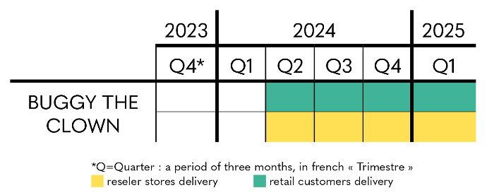 Concerning Buggy The Clown - HQS Dioramax, you can rely on the estimated delivery period indicated on the product sheet for the moment, with shipments scheduled from Q2 2024 to Q1 2025, for individuals and partner and reseller stores.