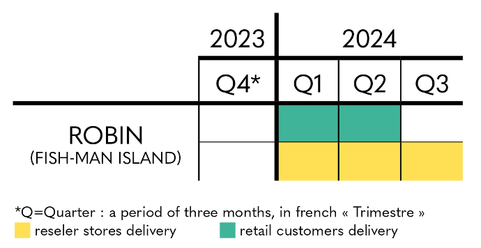 Deliveries of Robin (Fish-Man Island) - Ikigai are expected to last from the first quarter of 2024 to the second quarter of 2024 for retail customers and partner stores while deliveries to reseller stores are expected to last from the first quarter of 2024 to the third quarter of 2024. .