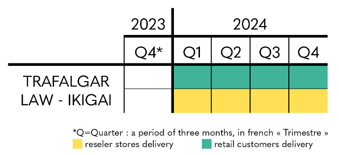 Regarding Trafalgar Law - Ikigai, deliveries are expected to last from the first quarter of 2024 to the second quarter of 2024 for retail customers and partner stores while deliveries to reseller stores are expected to last from the first quarter of 2024 to the third quarter of 2024.