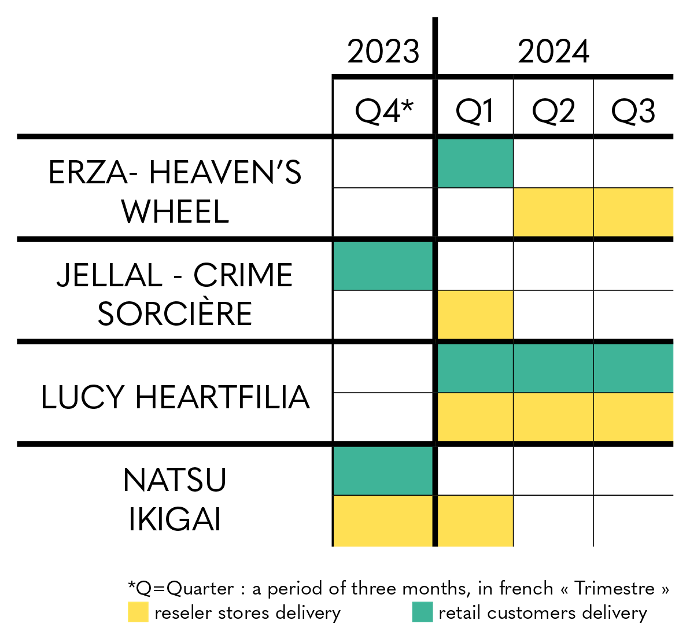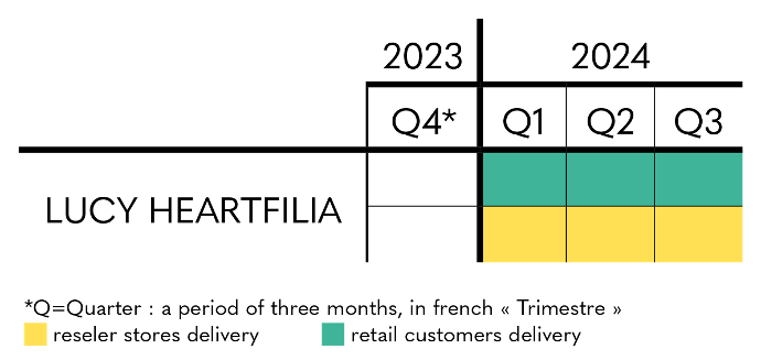 Regarding Lucy Hearfilia - Ikigai, you can for the moment rely on the estimated delivery period indicated on the product sheet, with shipments scheduled from the first quarter of 2024 to the third quarter of 2024, for individuals and partner stores and resellers.