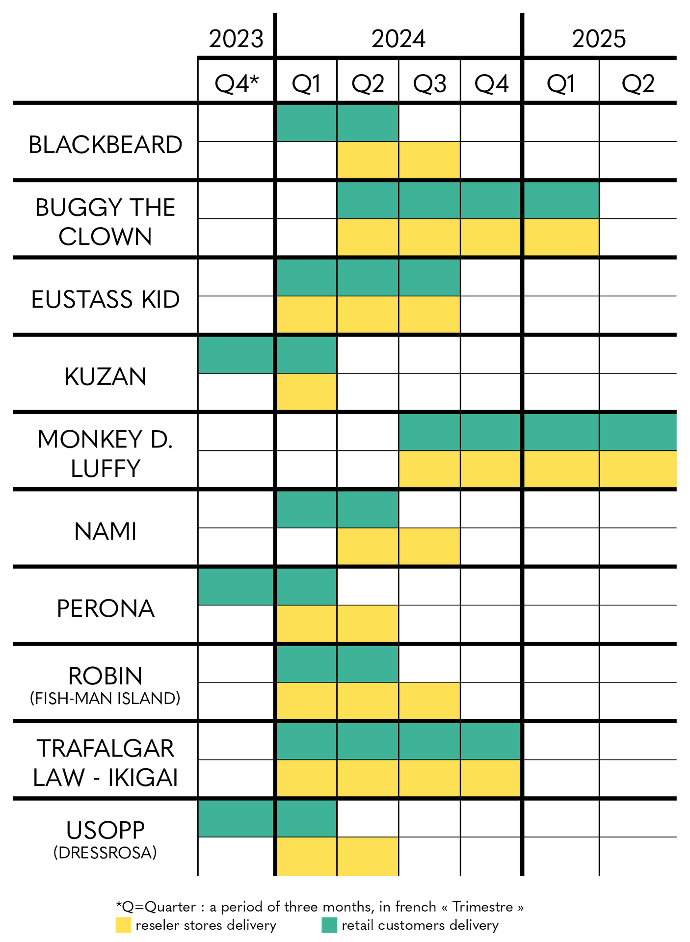 Concerning Eustass Kid - Ikigai, you can rely on the estimated delivery period indicated on the product sheet for the moment, with shipments planned from Q1 2024 to Q3 2024, for individuals and partner and reseller stores.
